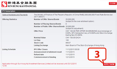 Subscribe the Ministry of Finance of the People's Republic of China RMB2,000,000,000 Fixed Rate Bonds due 2017 (the “Bonds”) to enjoy the “3-Fee Waiver offer”. Subscription cut off at 2:30pm on 11 December 2015.